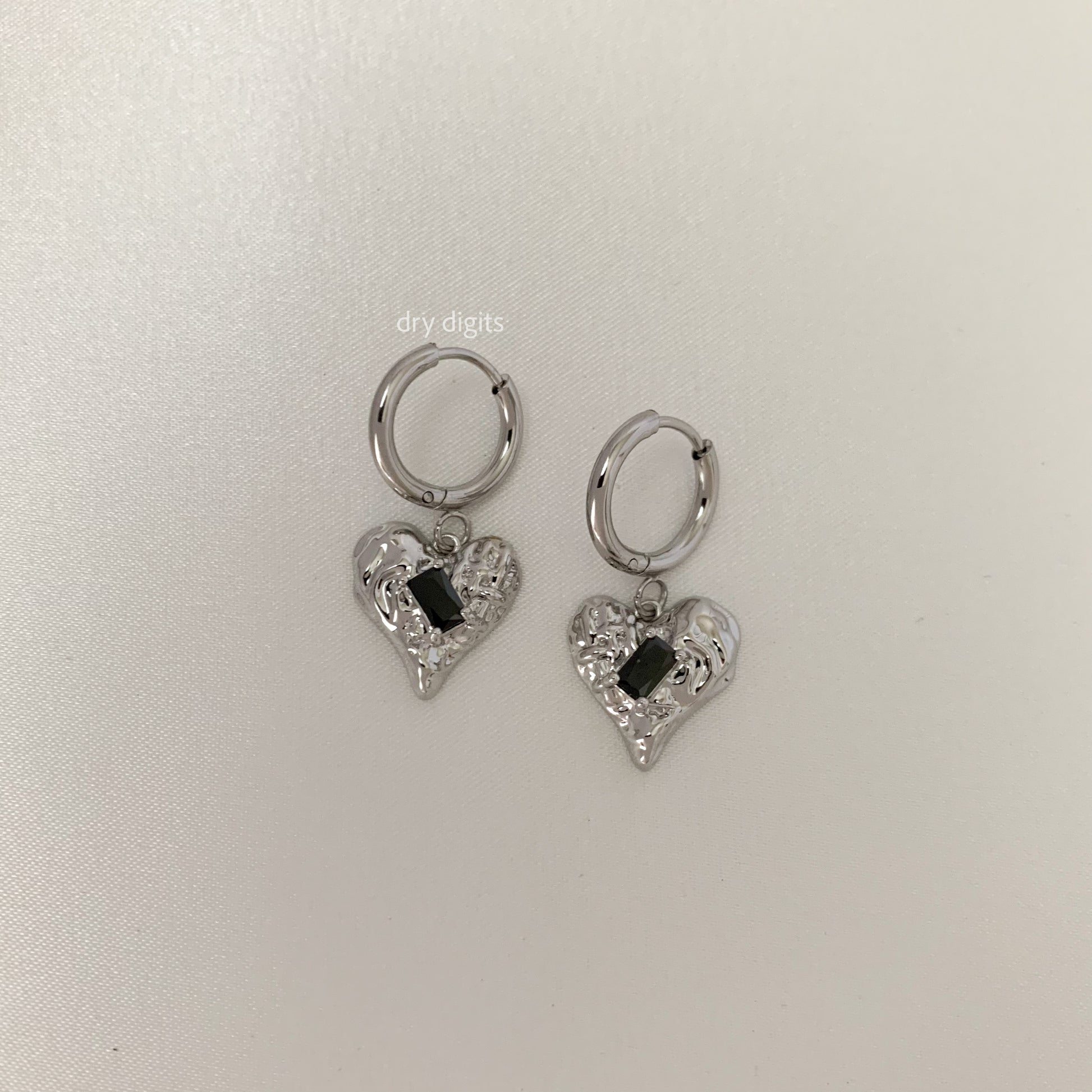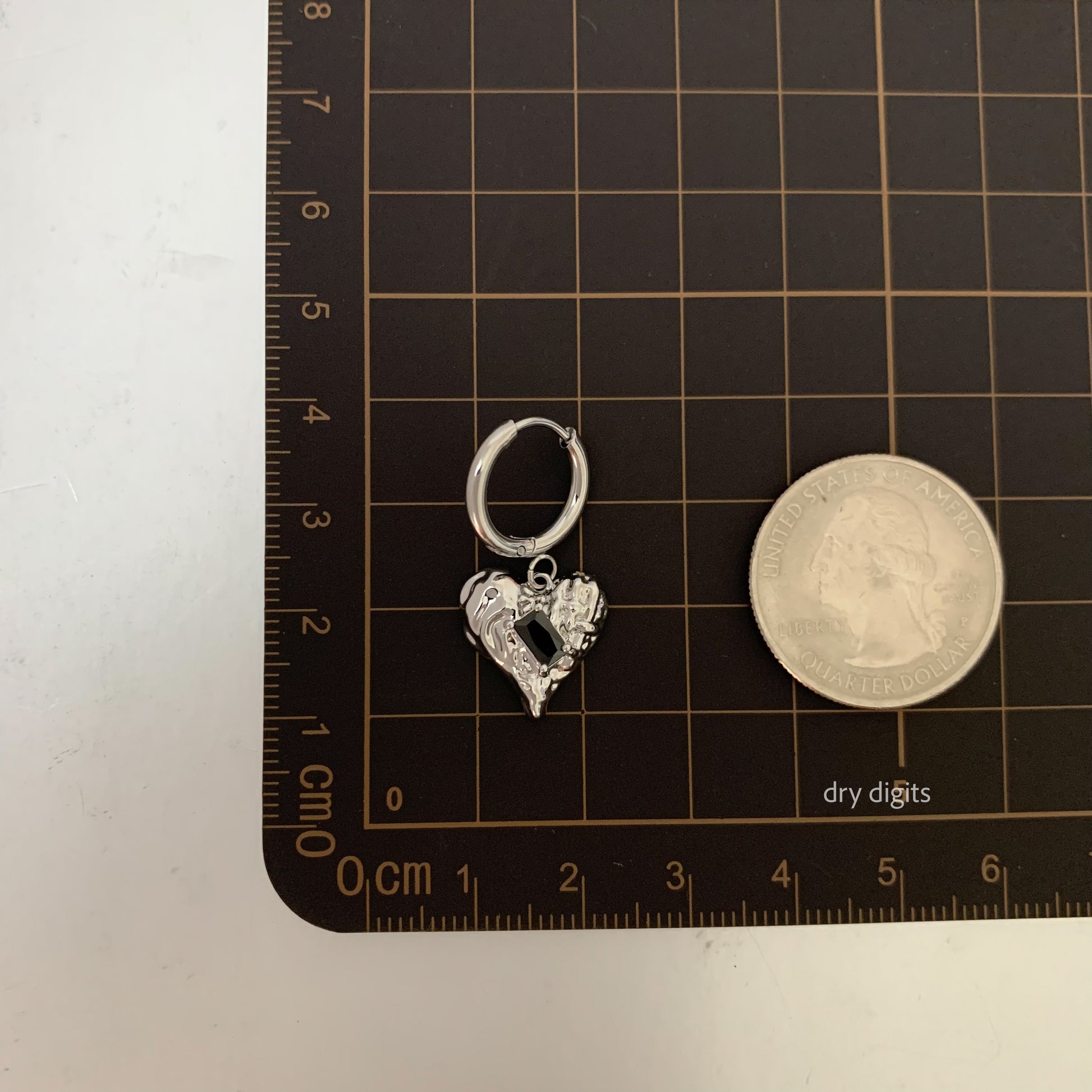 Molten Silver Heart Hoop Earrings – Black Gem Accent Dangles